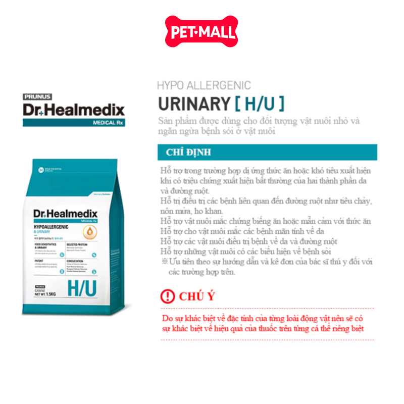 - Dr. Healmedix Hypoallergenic & Urinary H/U là thức ăn hạt chuyên biệt, được bào chế để hỗ trợ chó mắc các bệnh về đường tiết niệu như sỏi struvite và oxalate. Sản phẩm cũng giúp giảm thiểu các phản ứng dị ứng thức ăn nhờ công thức độc đáo.