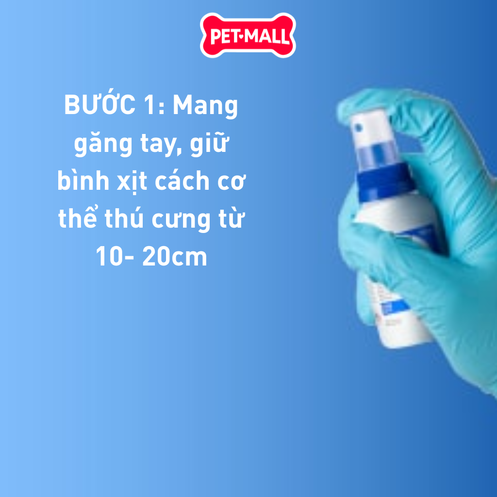 Mang găng tay và giữ bình xịt cách cơ thể thú cưng 10-20cm.