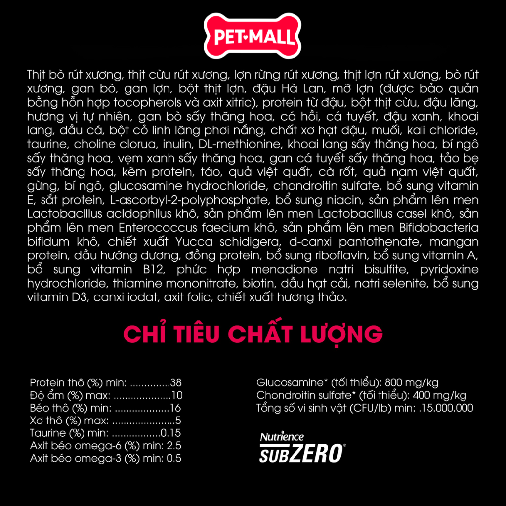 - Dưỡng chất bổ sung: Glucosamine, Chondroitin, Taurine, vẹm xanh New Zealand, bí đỏ, dầu gan cá tuyết, tảo biển Acadian, prebiotic, probiotic, vitamin và khoáng chất.