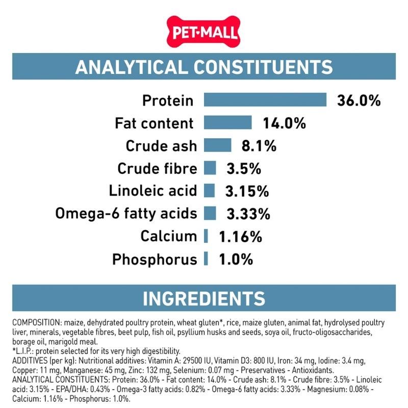 Thành phần chính: Ngô, protein gia cầm sấy khô, gluten lúa mì, gạo, mỡ động vật, protein động vật thủy phân, bột củ cải đường, dầu cá (nguồn Omega-3), dầu đậu nành (nguồn Omega-6),...