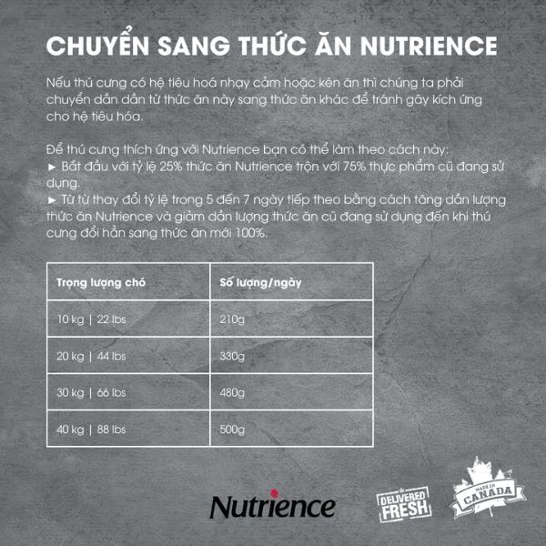 Khi chuyển sang Nutrience Infusion, nên trộn dần dần với thức ăn cũ trong khoảng 7 ngày để hệ tiêu hóa làm quen.