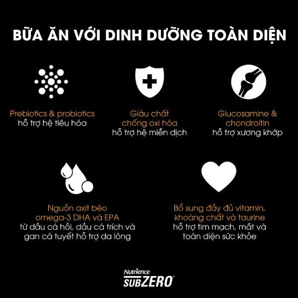 Rau củ & Dưỡng chất: Rau củ tươi, viên thịt gà sấy lạnh Nutriboost, Glucosamine, Chondroitin, Prebiotics, Probiotics, Vitamin và khoáng chất thiết yếu.