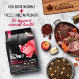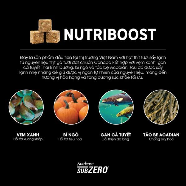Thành phần chính: Thịt bò rút xương, thịt cừu rút xương, lợn rừng rút xương, thịt lợn rút xương, gan bò, gan lợn, bột thịt lợn, đậu Hà Lan, cá hồi, cá tuyết, cùng với Nutriboost™ sấy thăng hoa từ gan bò tươi sống.