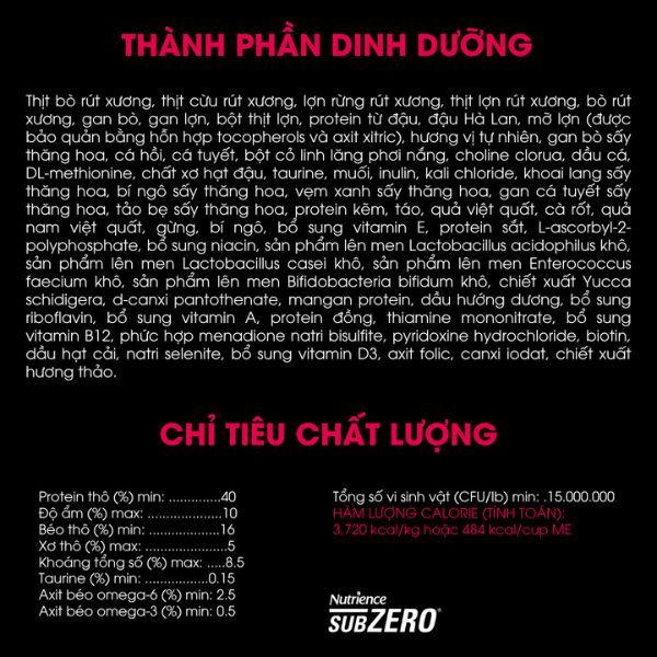 Dưỡng chất bổ sung: Taurine, prebiotics và probiotics, vẹm xanh New Zealand, bí ngô, dầu gan cá tuyết, tảo bẹ Acadian, vitamin và khoáng chất.