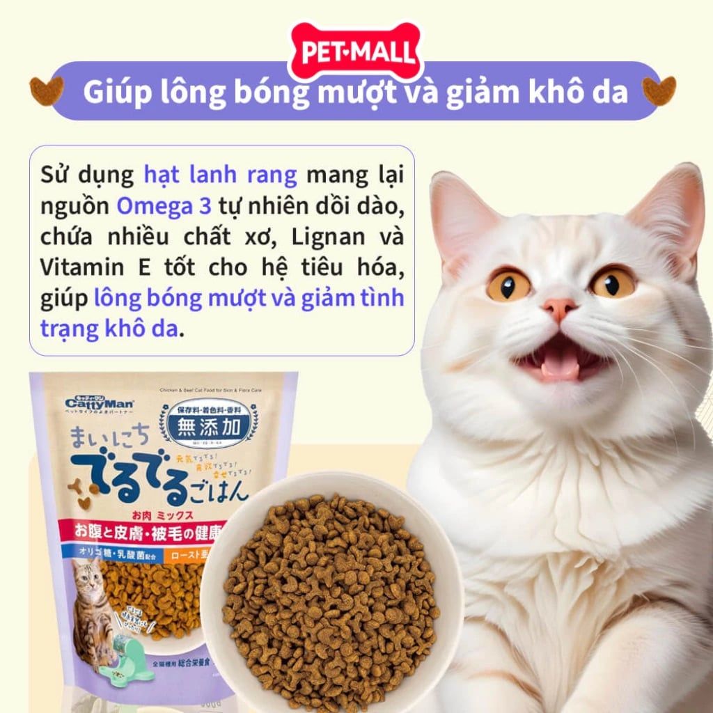 Hỗ trợ Tiêu Hóa & Đường Ruột: Bổ sung Lợi khuẩn Lactobacillus và Chất xơ tự nhiên (từ bột Okara) giúp cân bằng hệ vi sinh đường ruột, ngăn ngừa rối loạn tiêu hóa, giảm mùi phân và hỗ trợ đẩy búi lông ra ngoài dễ dàng.