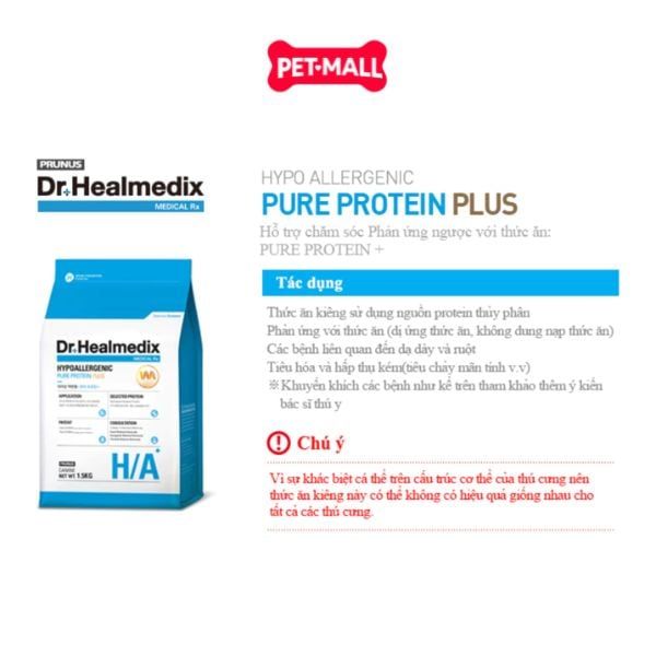 - Dr. Healmedix Hypoallergenic Pure Protein Plus H/A là thức ăn hạt chuyên biệt, được bào chế để hỗ trợ chó mắc các bệnh dị ứng thức ăn hoặc nhạy cảm với các thành phần dinh dưỡng. Sản phẩm giúp giảm thiểu các phản ứng không mong muốn và hỗ trợ sức khỏe da, hệ tiêu hóa.