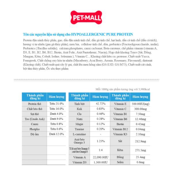 Khoai tây, bột cá hồi thủy phân, bột yến mạch, dầu cọ, dầu đậu nành, dầu cá, lecithin, vitamin E, men vi sinh FOS, khoáng chất, vitamin.