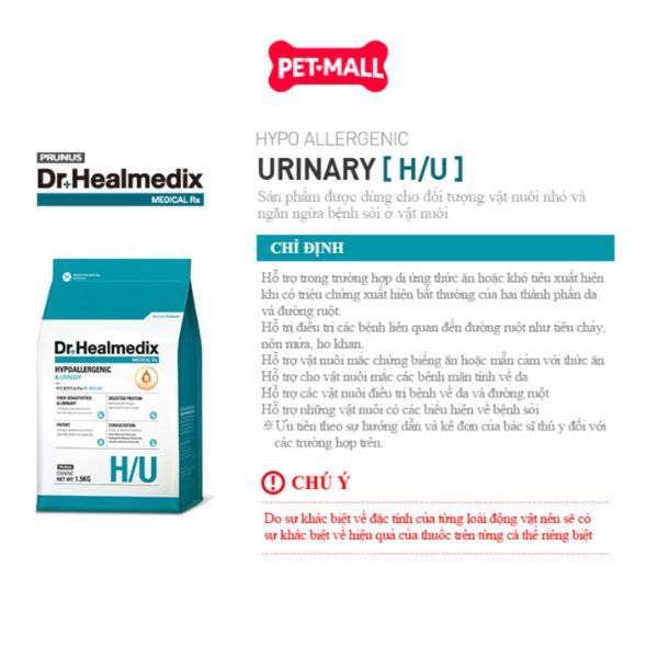 - Dr. Healmedix Hypoallergenic & Urinary H/U là thức ăn hạt chuyên biệt, được bào chế để hỗ trợ chó mắc các bệnh về đường tiết niệu như sỏi struvite và oxalate. Sản phẩm cũng giúp giảm thiểu các phản ứng dị ứng thức ăn nhờ công thức độc đáo.