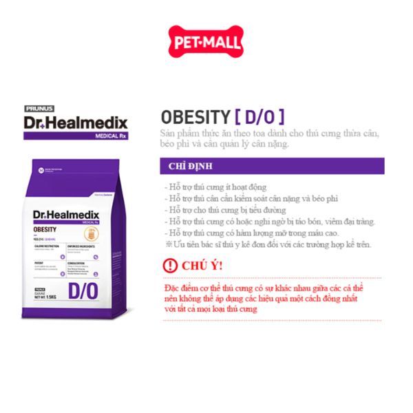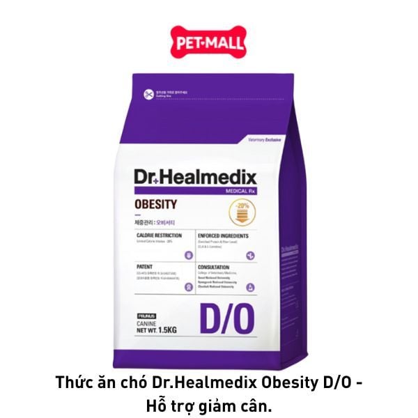- Dr. Healmedix Obesity D/O là thức ăn hạt chuyên biệt, được bào chế để hỗ trợ chó giảm cân một cách an toàn và hiệu quả. Sản phẩm giúp chó có cảm giác no lâu, giảm cảm giác thèm ăn, từ đó kiểm soát lượng calo nạp vào cơ thể, đồng thời cung cấp đầy đủ dưỡng chất để duy trì sức khỏe tổng thể.