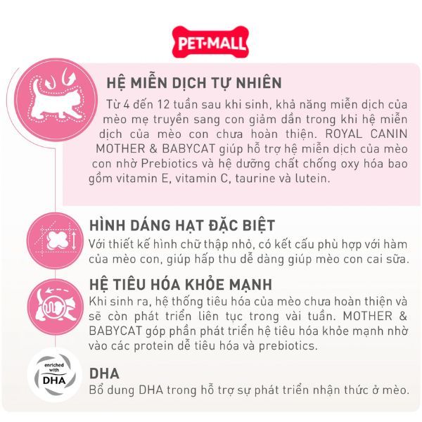 Tăng cường hệ miễn dịch: Chứa phức hợp các chất chống oxy hóa bao gồm vitamin E, C, taurine và lutein, giúp xây dựng và bảo vệ hệ miễn dịch tự nhiên của mèo con.