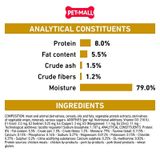 Thành phần nguyên liệu: Thịt và dẫn xuất từ động vật, ngũ cốc, dẫn xuất từ thực vật, khoáng chất, men, dầu, đường.
