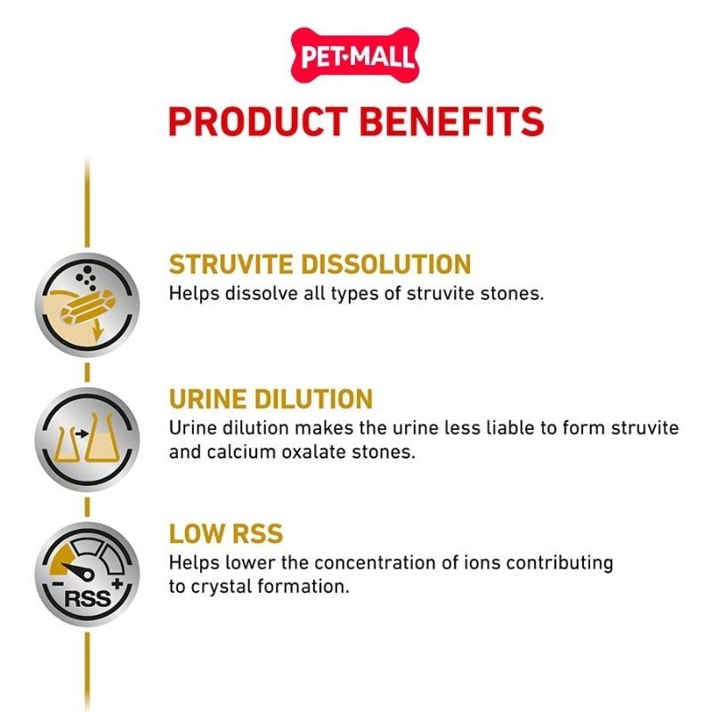 Hỗ trợ hòa tan sỏi: Sản phẩm giúp hòa tan hiệu quả sỏi struvite (ammonium magnesium phosphate) có trong bàng quang của chó.