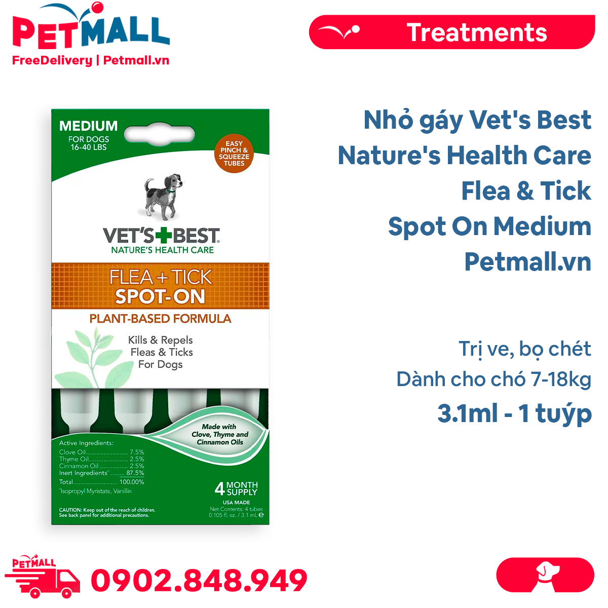 Nhỏ gáy Vet's Best Nature's Health Care Flea & Tick Spot On Medium 3.1ml - 1 tuýp - Trị ve, bọ chét cho chó 7-18kg Petmall