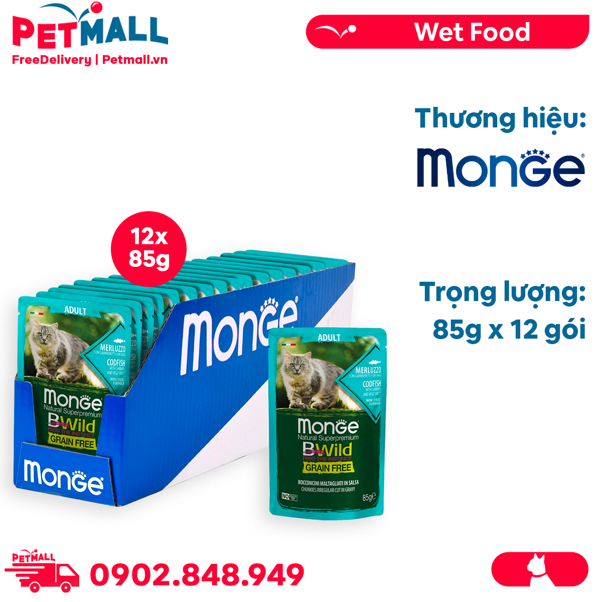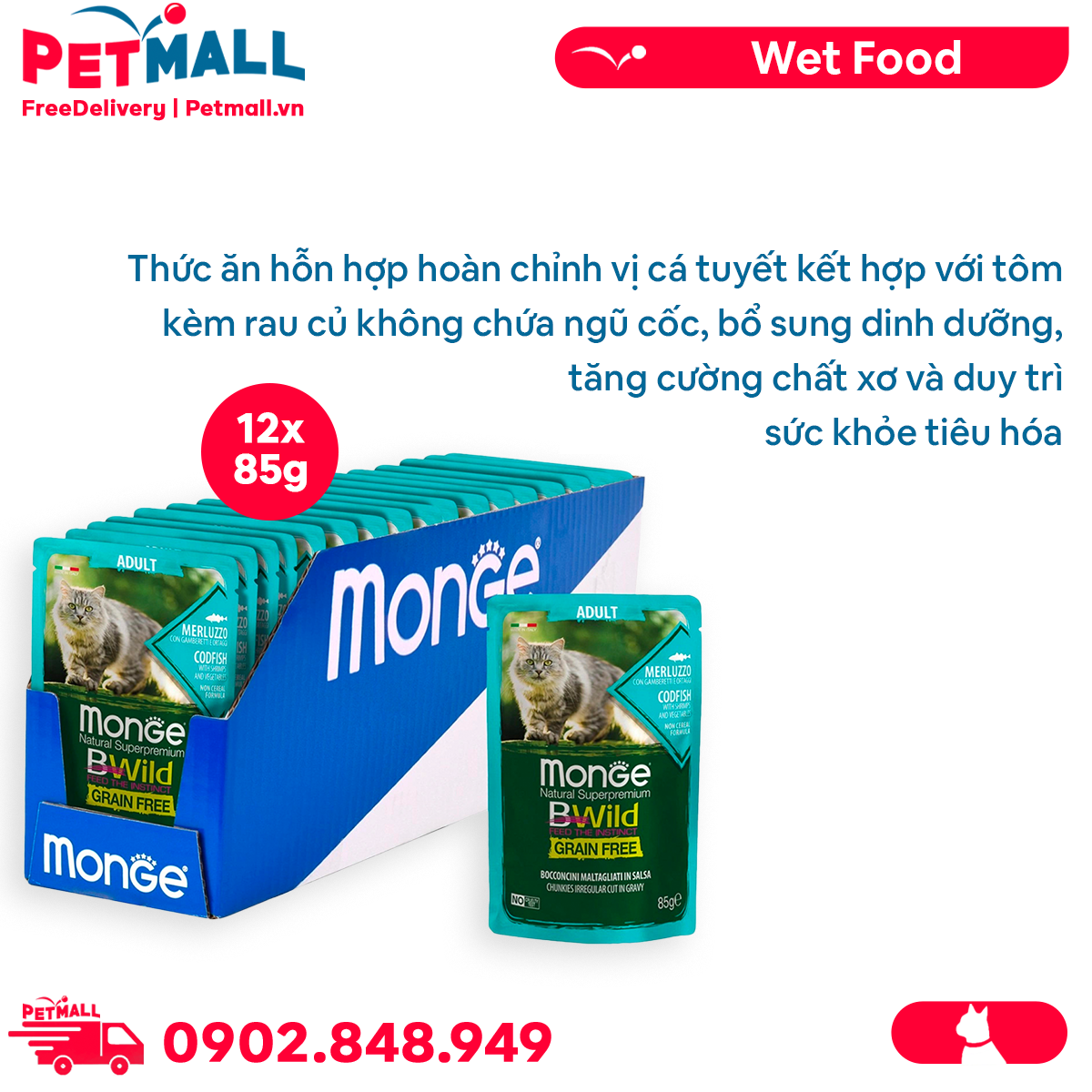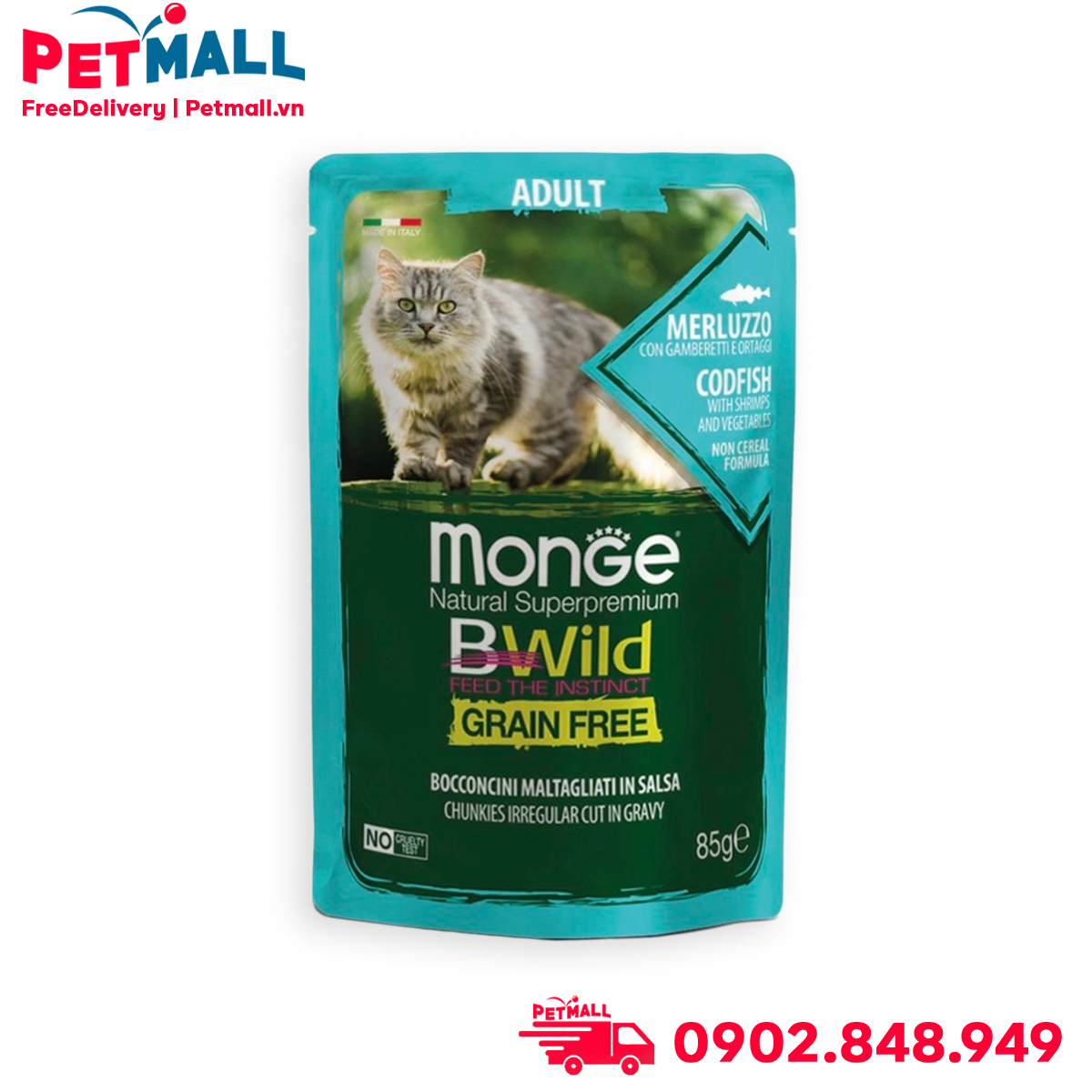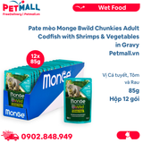 - Hộp 12 Gói 85G - Pate mèo Monge Bwild Chunkies Adult Codfish with Shrimps & Vegetables in Gravy - Vị Cá tuyết, tôm và Rau Petmall