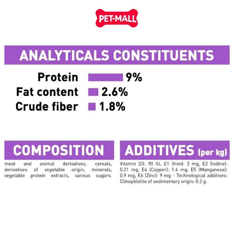 Thành phần nguyên liệu: Thịt và dẫn xuất từ động vật, ngũ cốc, dẫn xuất từ thực vật, khoáng chất, men, dầu, đường.