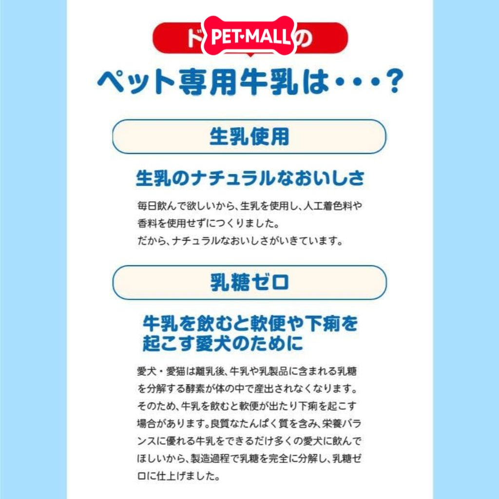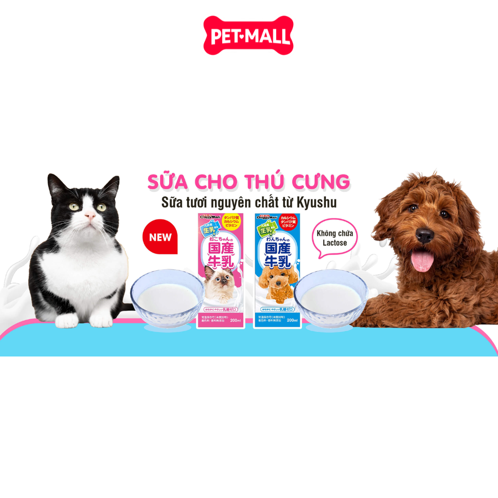 Sữa DoggyMan là sản phẩm sữa tươi nguyên chất được chế biến đặc biệt từ vùng Kyushu, Nhật Bản. Sản phẩm được loại bỏ lactose, thành phần gây khó tiêu ở hầu hết Chó, đồng thời bổ sung protein và Taurine chất lượng cao, là nguồn dinh dưỡng lý tưởng hàng nVịty để chăm sóc sức khỏe và tăng cường sức sống cho Chó cưng.