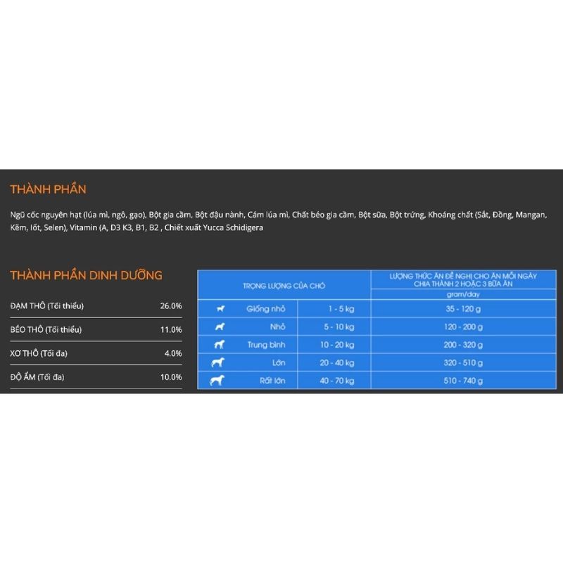 Thành phần nguyên liệu: Ngũ cốc nguyên hạt (lúa mì, ngô, gạo), bột gia cầm, bã nành, cám lúa mì, mỡ gia cầm, sữa bột, bột trứng, khoáng chất (sắt, đồng, mangan, kẽm, i-ốt, selen), vitamin (A, D3, K3, B1, B2, B6, B12, PP, E, Tocopherol), Canxi D-Pantothenate, Biotin, Axit Filoic, Choline, Dicalclum, Phosphate, Canxi Caribonate, Natri clorua, Chất bảo quản, chất chống oxi hóa, màu thực phẩm, chất làm ngon miệng, hương vị sữa, chiết xuất Yucca Schidigera.