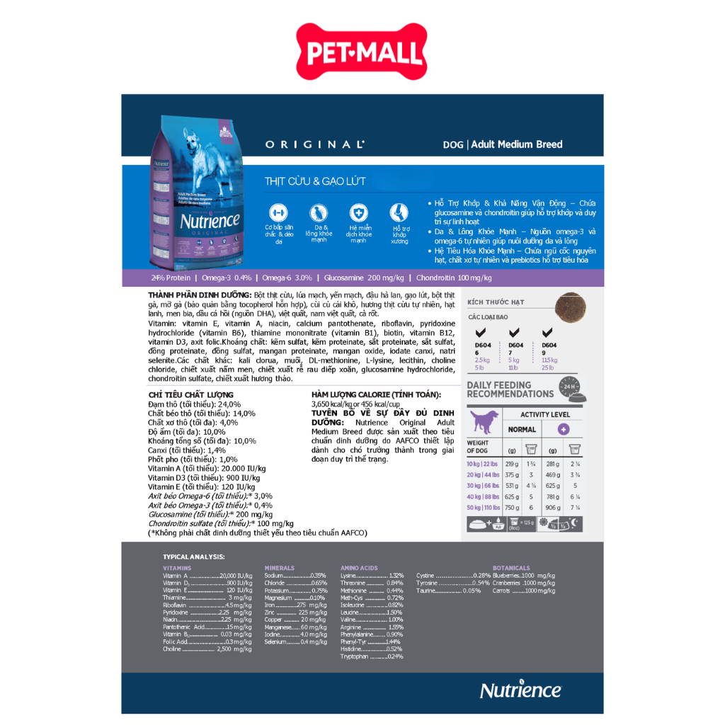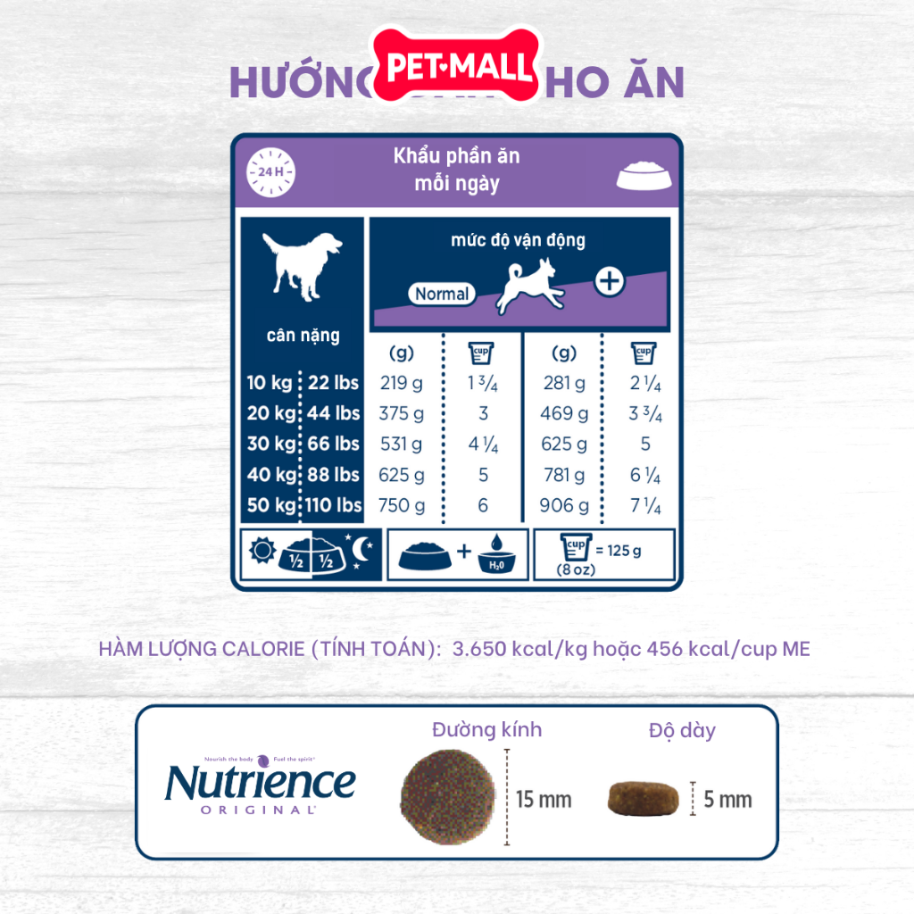 Liều lượng: Lượng thức ăn phụ thuộc vào cân nặng, tuổi, mức độ vận động và môi trường của chó. Nên bắt đầu theo bảng định lượng trên bao bì và điều chỉnh nếu cần.