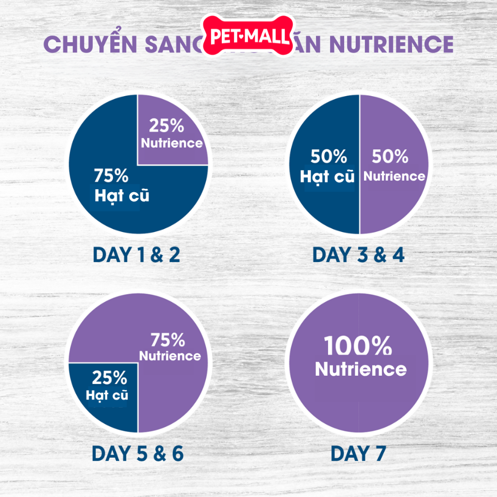 Chuyển đổi thức ăn: Chuyển đổi dần dần trong 5-7 ngày bằng cách tăng dần lượng thức ăn Nutrience mới và giảm dần lượng thức ăn cũ.