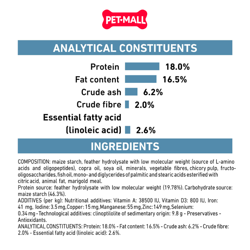 Thành phần chính: Tinh bột ngô, protein lông thủy phân với trọng lượng phân tử thấp (L.I.P.), dầu dừa, dầu đậu nành, khoáng chất,...