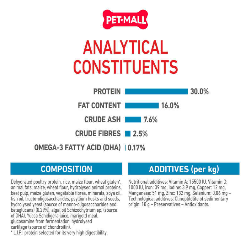 Thành phần chính: Protein gia cầm sấy khô, gạo, ngô, lúa mì, mỡ động vật, protein thực vật dễ tiêu hóa (L.I.P.), dầu cá (nguồn DHA),...