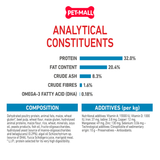 Thành phần chính: Protein gia cầm sấy khô, ngô, gạo, mỡ động vật, protein thực vật dễ tiêu hóa (L.I.P.), dầu cá, dầu đậu nành,...