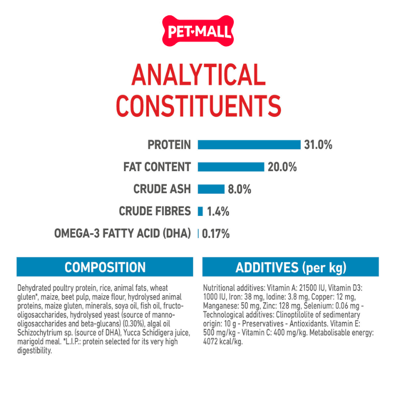 Thành phần chính: Protein gia cầm sấy khô, gạo, ngô, mỡ động vật, protein thực vật dễ tiêu hóa (L.I.P.), dầu cá (nguồn DHA),...