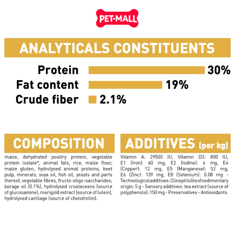 Thành phần chính: Protein gia cầm sấy khô, ngô, gạo, gluten lúa mì (L.I.P.), mỡ động vật, dầu lưu ly, dầu cá, dầu đậu nành,...