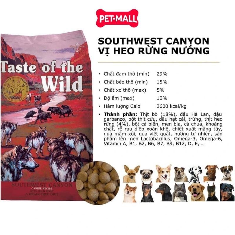 Nếu bạn đang tìm kiếm một chế độ dinh dưỡng giàu đạm với hương vị độc đáo và hoang dã cho chó cưng, Taste of the Wild - Southwest Canyon Canine Recipe là lựa chọn tuyệt vời! Công thức đặc biệt này nổi bật với thịt heo rừng hoang dã, kết hợp cùng thịt bò, thịt cừu và trứng, tạo nên một nguồn protein chất lượng cao, giúp tăng cường sức khỏe và phát triển cơ bắp săn chắc. Bên cạnh đó, các loại đậu, việt quất, mâm xôi cung cấp chất chống oxy hóa mạnh mẽ, hỗ trợ hệ miễn dịch khỏe mạnh toàn diện.