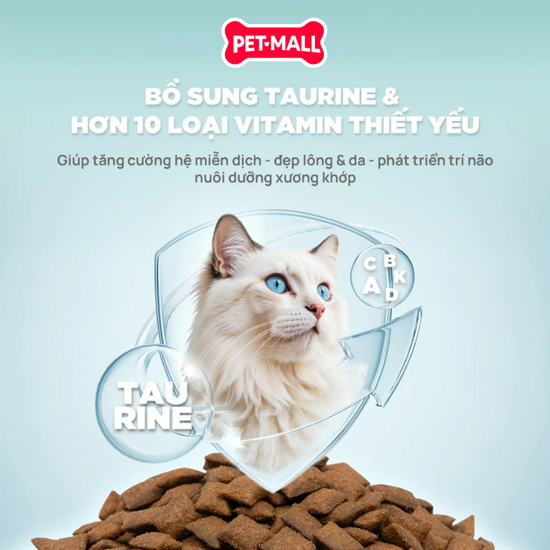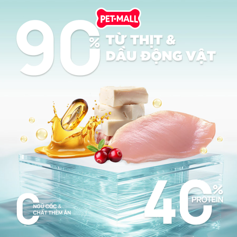 Dinh dưỡng vượt trội: Với hơn 40% protein dễ hấp thu từ 90% thịt và dầu động vật, sản phẩm đáp ứng nhu cầu năng lượng và dưỡng chất cao, hỗ trợ phát triển cơ bắp, xương khớp, da lông sáng mượt của mèo con.