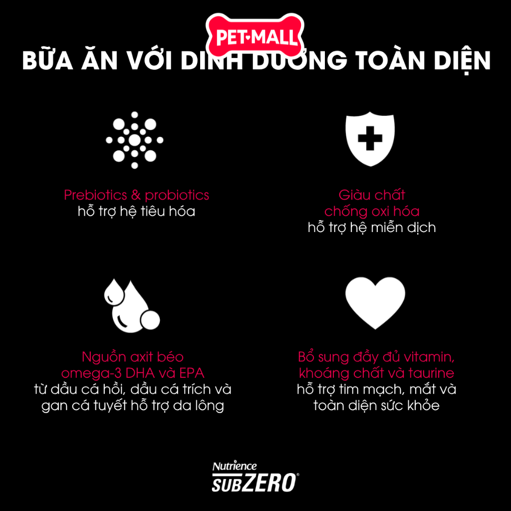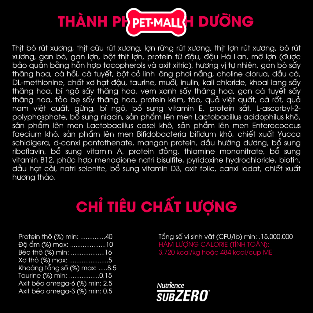 Dưỡng chất bổ sung: Taurine, prebiotics và probiotics, vẹm xanh New Zealand, bí ngô, dầu gan cá tuyết, tảo bẹ Acadian, vitamin và khoáng chất.