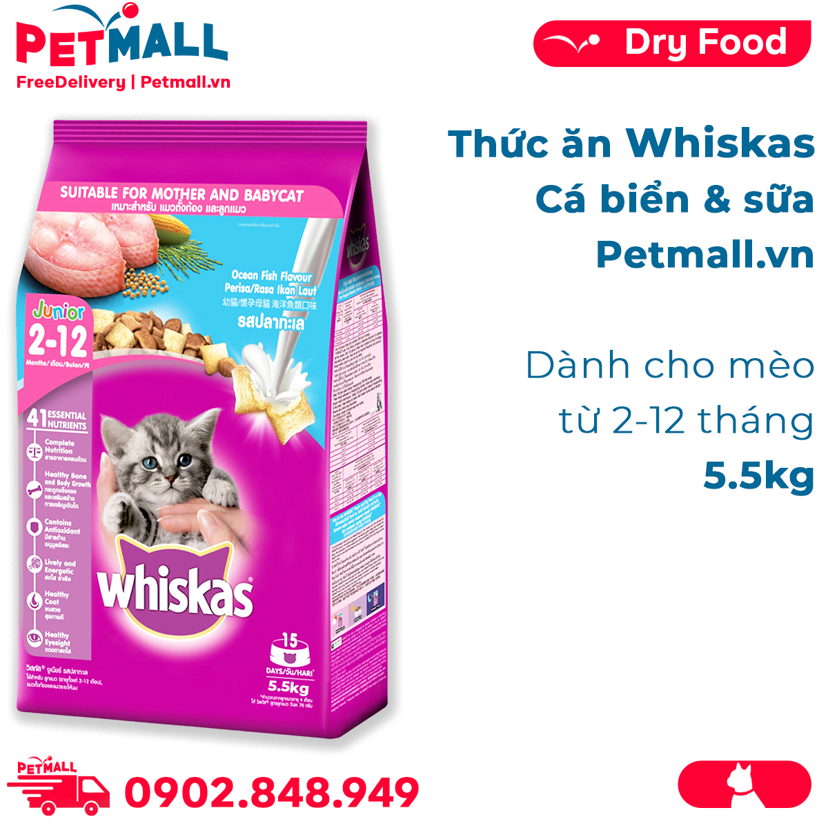 5.5KG - Thức ăn WHISKAS Ocean Fish Flavour Junior - Vị cá biển & sữa (cho mèo từ 2-12 tháng) Petmall