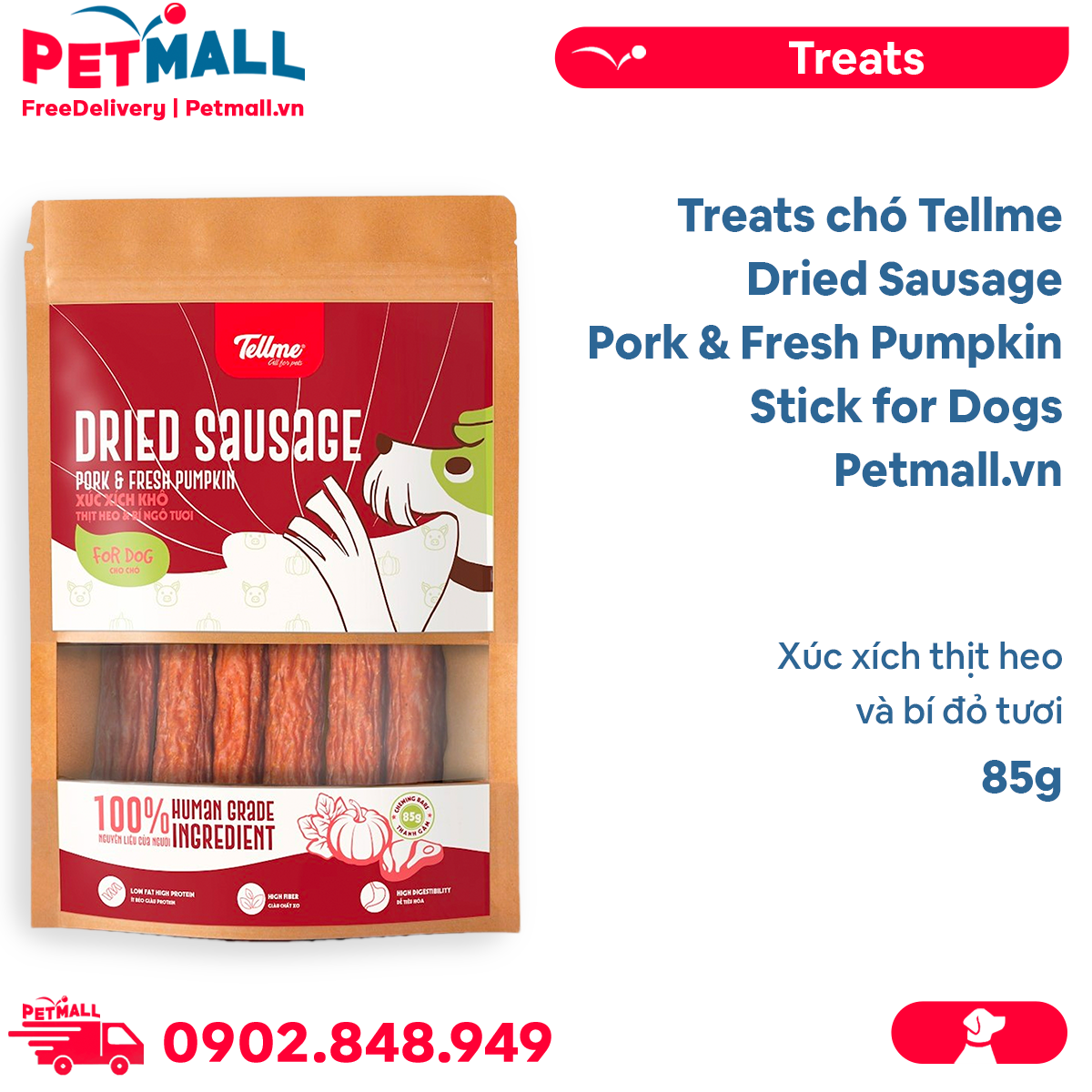 Treats chó Tellme Dried Sausage Pork & Fresh Pumpkin Stick for Dogs 85g - Xúc xích thịt heo và bí đỏ tươi Petmall