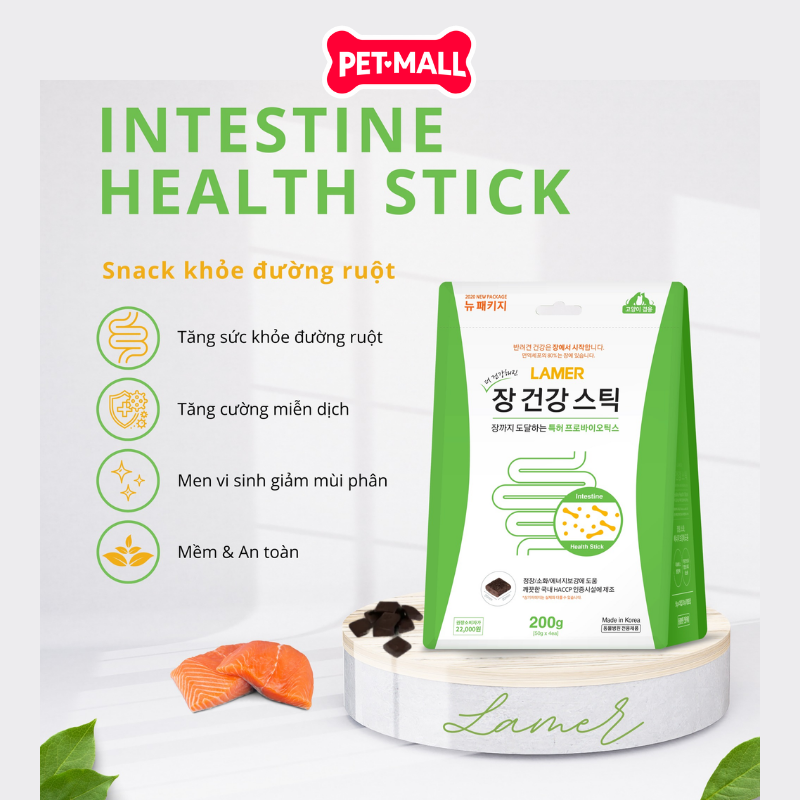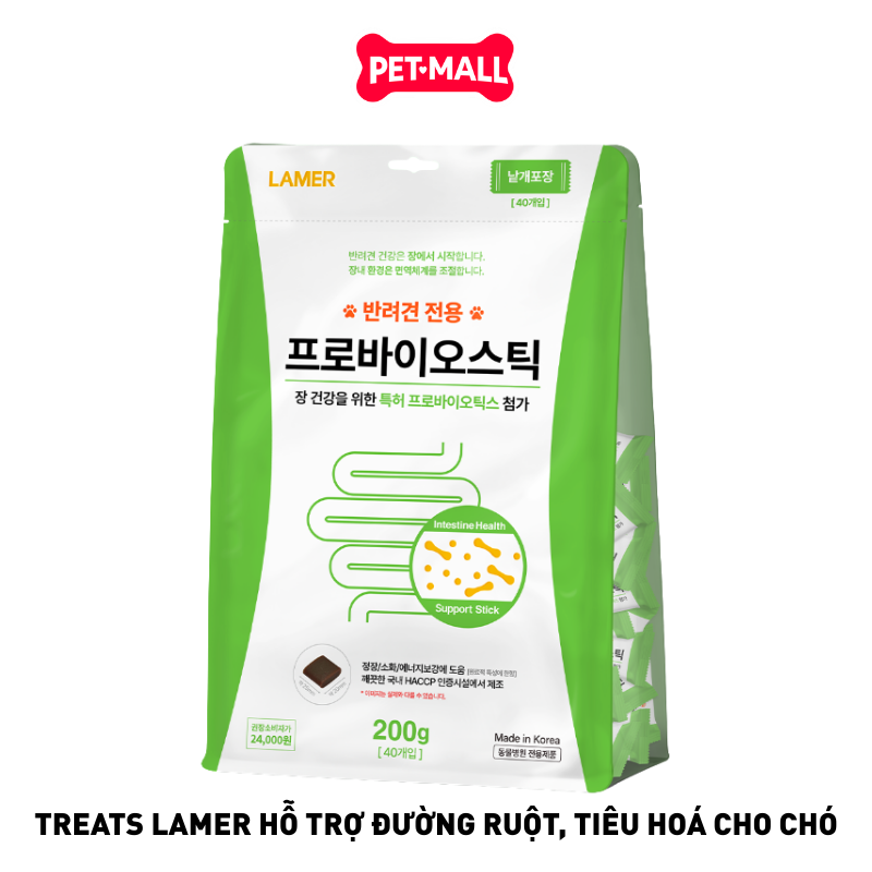 Treats LAMER Intestinal Health Probio Stick 200G - Men vi sinh hỗ trợ đường ruột, giúp hệ tiêu hoá khoẻ mạnh cho chó Probiostick là sản phẩm men vi sinh được bào chế để hỗ trợ sức khỏe đường ruột và tiêu hóa cho chó. Với các vi sinh vật có lợi (probiotics) và các dưỡng chất bổ trợ, sản phẩm giúp cân bằng hệ vi sinh, cải thiện chức năng tiêu hóa và tăng cường sức đề kháng cho thú cưng của bạn.